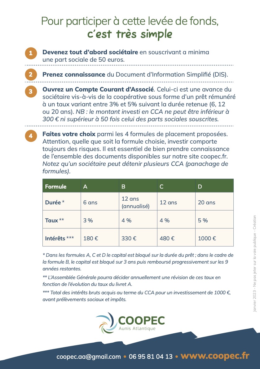 Créée au printemps 2022, la COOPEC est une coopérative d’énergies citoyennes et renouvelables (EnR) en Aunis Atlantique. Elle regroupe, sous le statut d’une Société Coopérative d’Intérêt Collectif (SCIC), des citoyens, des collectivités territoriales, des entreprises locales et des associations.